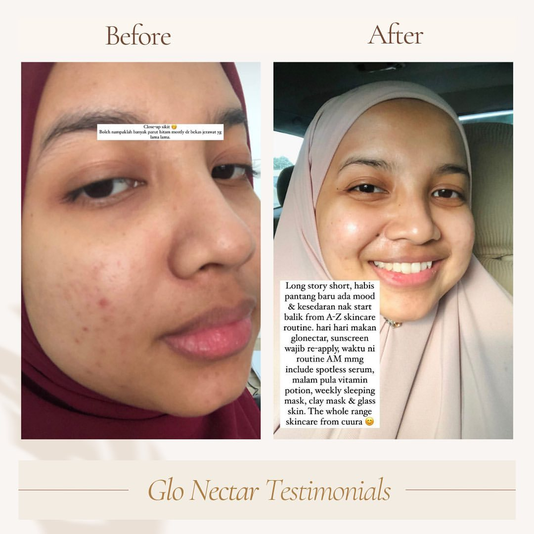 “I absolutely love Glo Nectar! 😍 I first started drinking it in December 2024 when my skin suddenly reacted with allergies from one of my skincare products. After just a week of consuming Glo Nectar twice a day, my skin is slowly becoming healthier and glowing again. It truly lives up to its tagline: ‘skincare that you can eat.’ If you’re looking for better skin from within, Glo Nectar is the answer.” — 36, Mom of three
